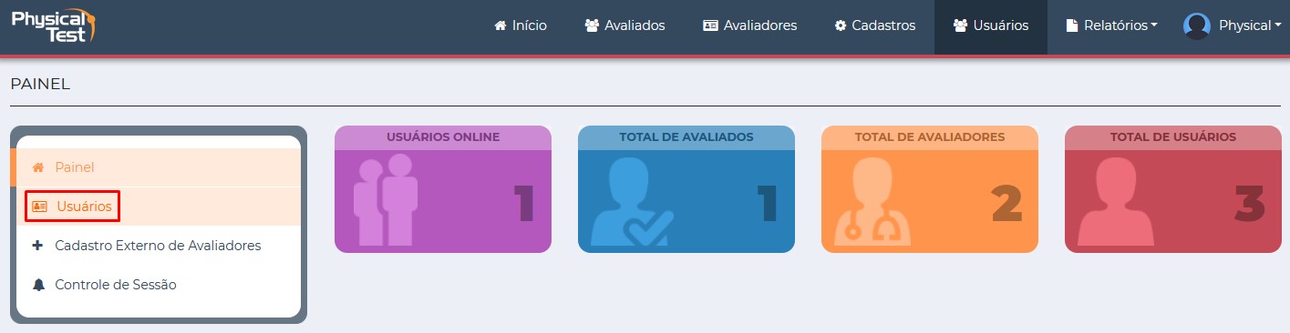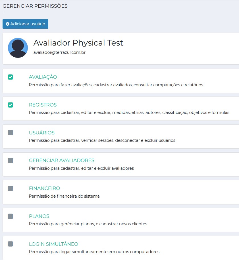 É possível mudar as permissões do que um usuário pode fazer no Physical Test. Mas, apenas um usuário com permissões de administrador pode mudar as permissões dos usuários que estão sob a sua gestão.