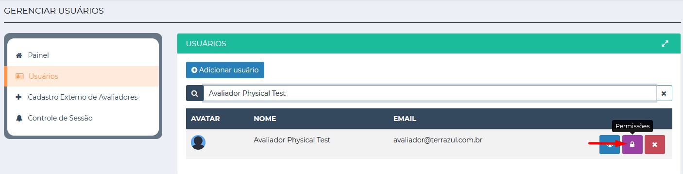 Ache o usuário para o qual quer alterar as permissões e clique em permissões.