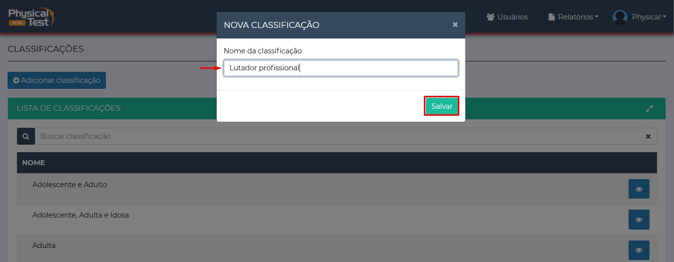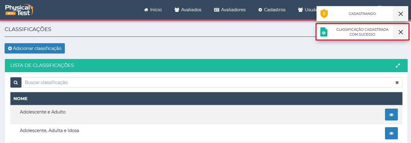 Depois de digitar a classficação e clicar em salvar será mostrada uma mensagem de cadastro feito como sucesso.