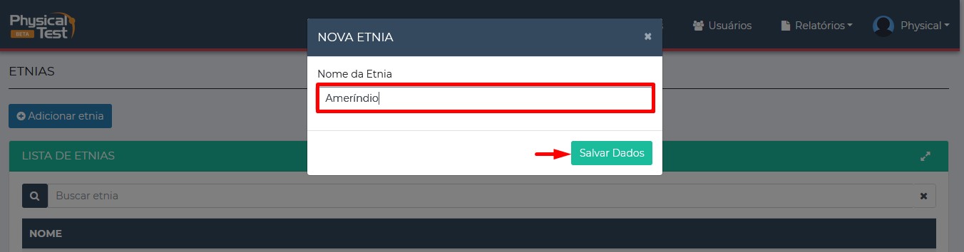 Digite o nome da etnia e depois clique em salvar dados.