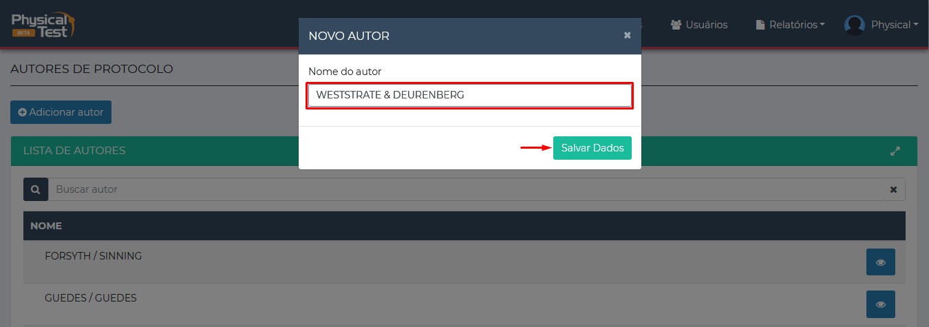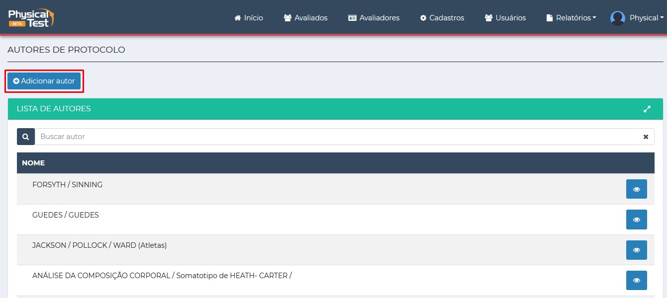 Para cadastrar autores de protocolos é necessário ter um usuário no Physical Test com a permissão para cadastrar registros. Leia aqui sobre como alterar as permissões dos usuários.
